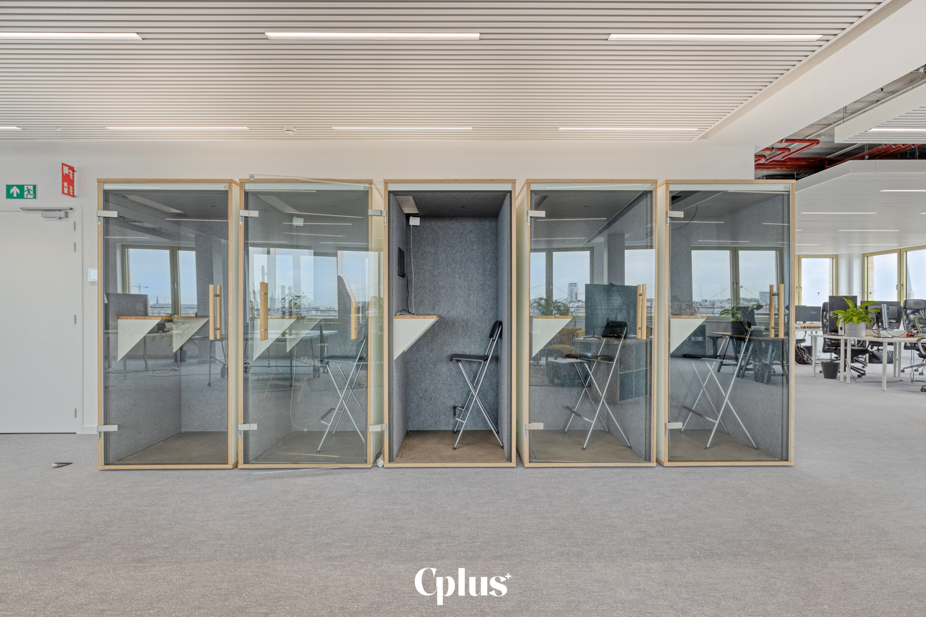 Zowel het klimaatplafond als de tapijtvloer zijn een bewuste ontwerpkeuze om te voldoen aan de hoge eisen die kantoorruimtes stellen qua ruimteakoestiek en spraakverstaanbaarheid.